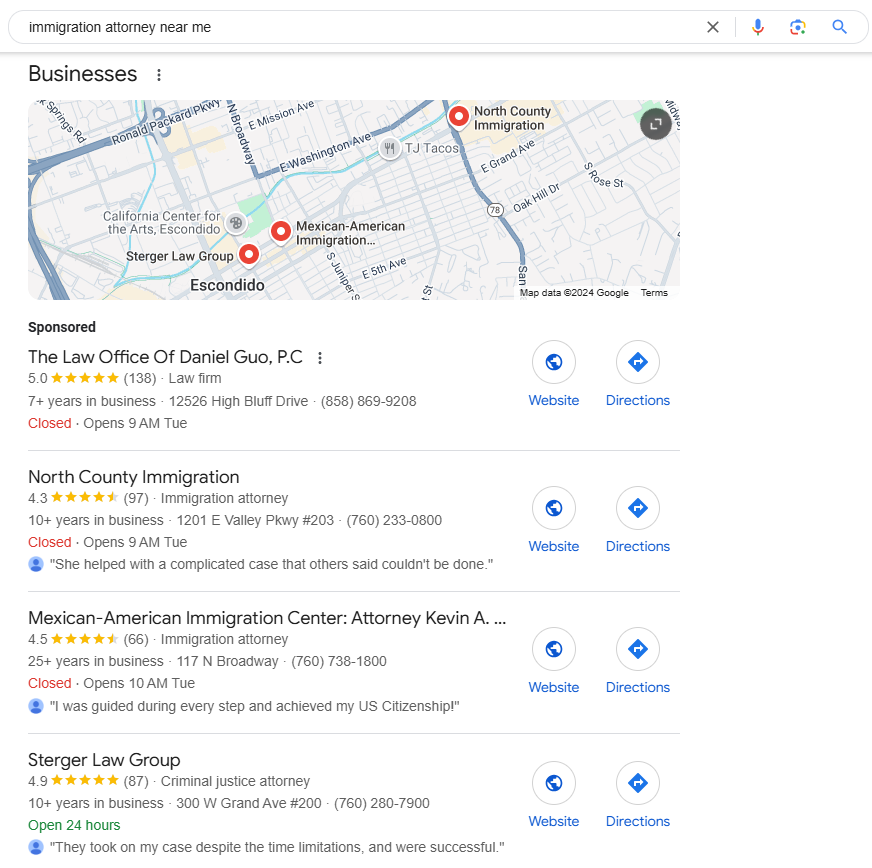 When searching "immigration attorney near me," we ranked this immigration law firm #2 in the maps section of Google for their target area for example.